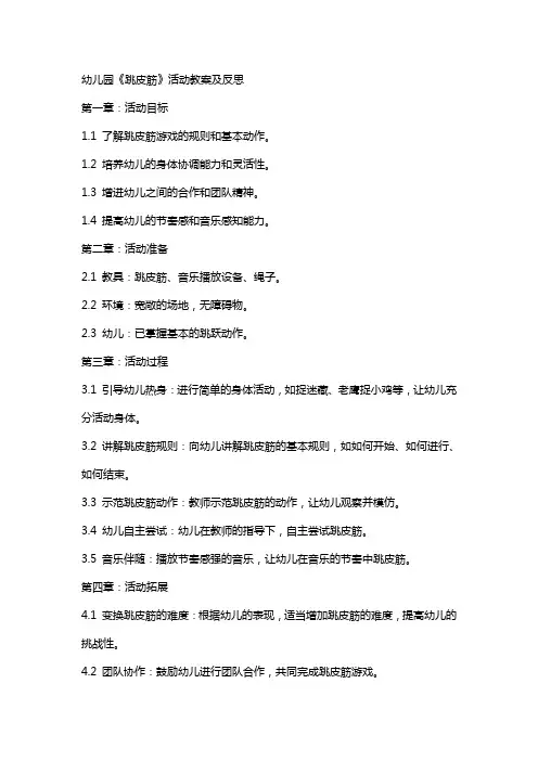 跳皮筋教案及反思教案:跳皮筋一、教学内容本节课的教学内容选自人教版《体育与健康》教材,第五章第二节“跳皮筋”。