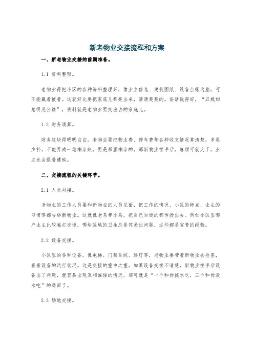 以下是一般的新老物业交接流程及要点:1. 了解物业状况:新物业管理公司首先要了解该物业的状况,包括:- 物业的基本信息,如建筑物结构、建筑面积、业主数量等。