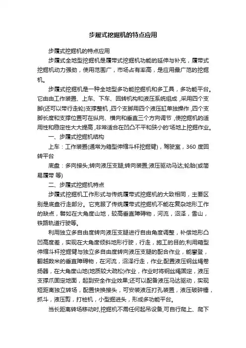 步履式挖掘机的特点应用步履式挖掘机的特点应用步履式全地型挖掘机是履带式挖掘机功能的延伸与补充,履带式挖掘机动力强劲,使用范围广,市场占有率高,是应用最广范的挖掘机。