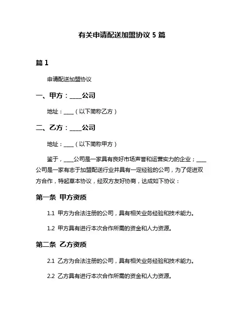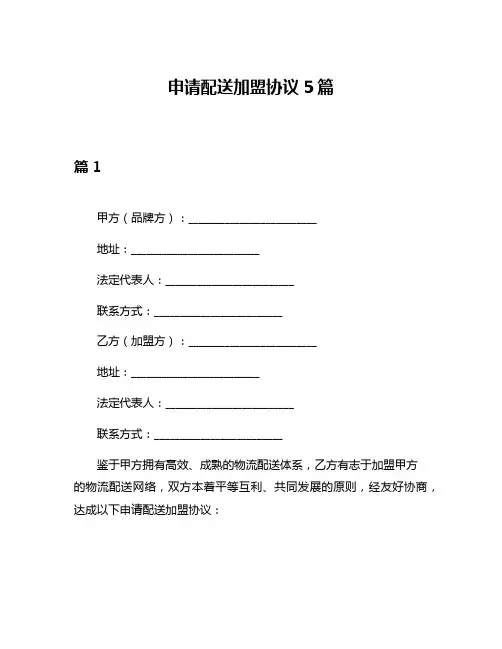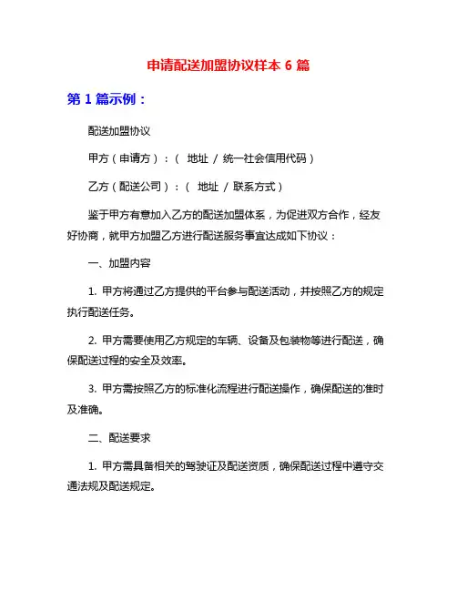 申请配送加盟协议样本6篇第1篇示例:配送加盟协议甲方(申请方):(地址/ 统一社会信用代码)乙方(配送公司):(地址/ 联系方式)鉴于甲方有意加入乙方的配送加盟体系,为促进双方合作,经友好协商,就甲方加盟乙方进行配送服务事宜达成如下协议:一、加盟内容1. 甲方将通过乙方提供的平台参与配送活动,并按照乙方的规定执行配送任务。