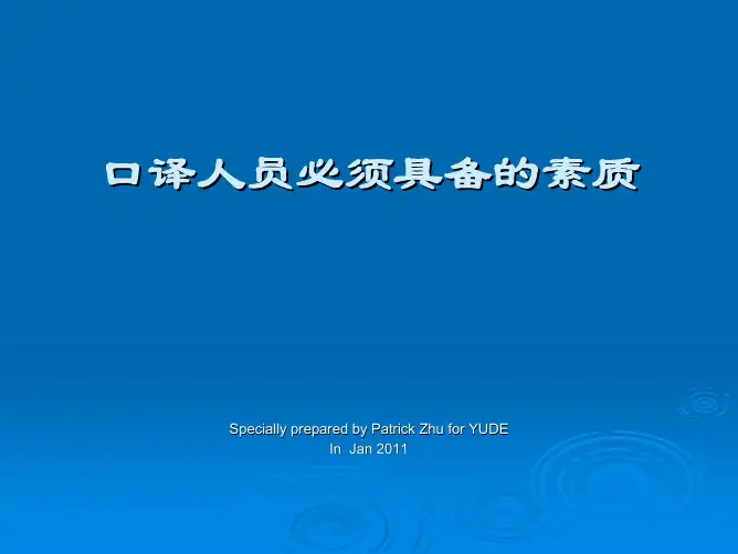 口译人员应该具备哪些素质口译人员应该具备哪些素质口译人员应该具备哪些素质?职业口译译员的挑选往往是从英语专业本科生中遴选出出类拔萃的学生,然后再选送到国家或国际著名的口译培训机构,接受两年左右的专门高强度的训练。