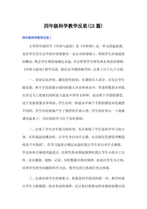 四年级科学教学反思(15篇)四年级科学教学反思1小学四年级科学《冷热与温度》是《冷和热》这一单元的起始课,是在学生对生活中的冷热现象有一定认识的基础上,帮助学生形成温度的概念,教会学生规范地测定水温,并且带领学生探究热水变凉的规律,《冷热与温度》教学反思。
