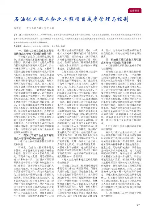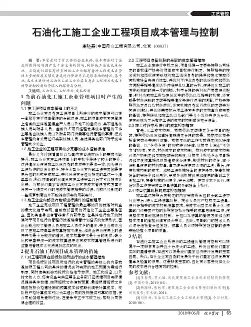 关键词:石油化工;工程项目;成本控制1当前石油化工施工企业管理项目时产生的问题1.1在工程项目成本管理上的不足施工企业其自身在工程项目上所进行的成本管理可以说一直都存在于项目管理的全部过程,施工的项目成本其在管理上通常的主体是直接生产人员以及施工的组织方,其不但是核销人员与财务人员。
