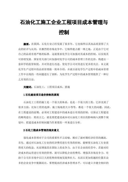 关键词:石油化工,施工企业,工程项目,成本管理,成本控制引言:近年来,石油化工行业的发展迅速,石油化工企业在国民经济中具有重要的地位。