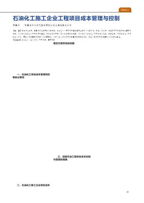 二、石油化工施工企业在工程项目成本管理和控制中的问题1.施工企业在项目成本管理中的不足和问题石油化工企业在工程项目中的成本管理,成本管理贯穿于项目管理的整个过程。