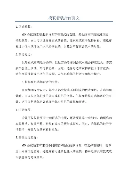 模联着装指南范文1.正式着装:MUN会议通常要求参与者穿着正式的衣服。