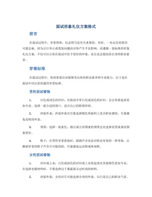 面试形象礼仪方案格式前言在面试过程中,穿着得体、仪态得当是至关重要的。