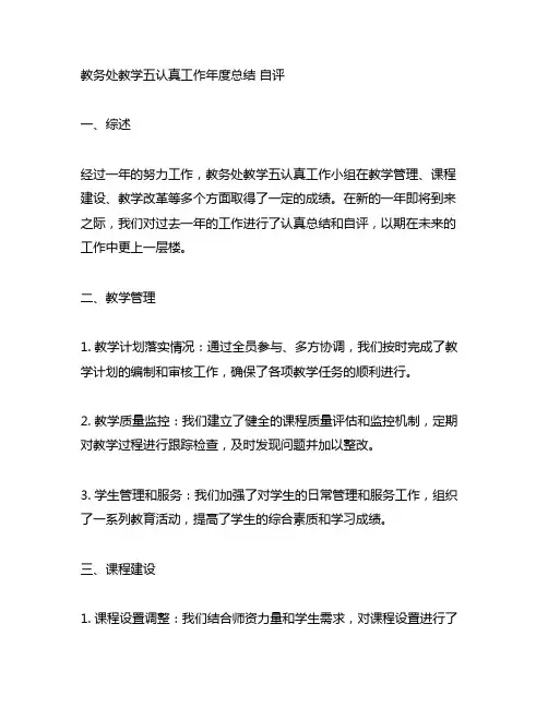 下面是小编为大家带来的教务处工作自我评价五篇,希望大家喜欢!教务处工作自我评价1教务处在上级相关部门的领导下,紧紧围绕学期初提出的学校办学思路及具体教学目标,科学安排,扎实工作,大胆创新,充分发挥教务处指导监督、整合推进的功能,进一步增强服务意识,深化教学改革,加强师资队伍建设,加强教学检查、规范教师的教学行为,出色地完成了学期初制定的各项工作计划,及时全面准确地为学校领导供给教学信息。