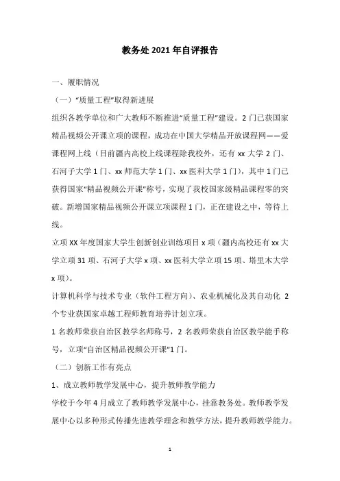 内部编号:AN-QP-HT382版本/ 修改状态:01 / 00 In Order T o Standardize The Management, Let All Personnel Enhance The Executive Power, Avoid Self-Development And Collective Work Planning Violation, According To The Fixed Mode To Form Daily Report To Hand In, Finally Realize The Effect Of Timely Update Progress, Quickly Grasp The Required Situation.编辑:__________________审核:__________________单位:__________________教务处2021年自评报告通用范本教务处2021年自评报告通用范本使用指引:本报告文件可用于为规范管理,让所有人员增强自身的执行力,避免自身发展与集体的工作规划相违背,按固定模式形成日常报告进行上交最终实现及时更新进度,快速掌握所需了解情况的效果。