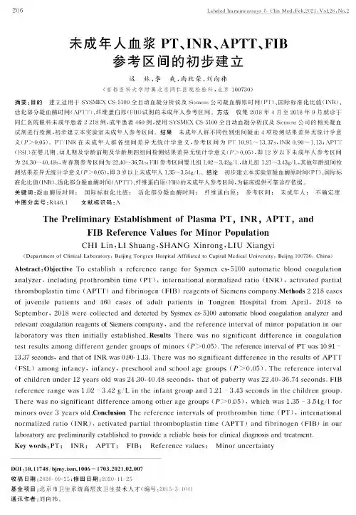 未成年人血浆PT、INR、APTT、FIB参考区间的初步建立迟林,李爽,尚欣荣,刘向祎(首都医科大学附属北京同仁医院检验科,北京100730)摘要:目的建立适用于SYSMEX CS5100全自动血凝分析仪及Siemens公司凝血酶原时间(PT)、国际标准化比值(NR)、活化部分凝血酶时间(APTT)、纤维蛋白原(FIB)试剂的未成年人参考区间.方法收集2018年4月至2018年9月就诊于同仁医院眼科未成年患者2218例,成年患者460例,使用SYSMEX CS-5100全自动血凝分析仪及Siemens公司的相关凝血试剂进行检测,初步建立本实验室未成年人参考区间.结果未成年人群不同性别组间凝血4项检测结果差异无统计学意义(P>0.75).PT7INR在未成年人群各组间差异无统计学意义,参考区间为PT10.91〜13.37s,INR0.90〜1.13;APTT(FSL)在婴儿期、幼儿期及学龄前期及学龄期四组间检测结果差异无统计学意义(P>0.75),即12岁以下未成年人参考区间为24.30〜40.48s,青春期参考区间为22.40〜36.74s;FI B参考区间婴儿组1.72〜3.42g/L,幼儿组1.21〜3.43g/L,其他年龄组间检测结果差异无统计学意义(P>0.05),即3岁以上未成年人1.35〜3.54g/L.结论初步建立本实验室凝血酶原时间(PT)、国际标准化比值(NR)、活化部分凝血酶时间(APTT)、纤维蛋白原(FIB)的未成年人参考区间,为临床提供可靠诊疗依据.关键词:凝血酶原时间;国际标准化比值;活化部分凝血酶时间;纤维蛋白原;参考区间;未成年人;不确定度中图分类号:R446.1文献标识码:AThe Preliminary Establishment of Plasma PT,INR,APTT,andFIB Reference Values for Minor PopulationCHI Lin,LI Shuang,SHANG Xinrong,LIU Xiangyi(Department of Clinical Laboratory,Beijing Tongren Hospital Affiliated to Capital Medical University,Beijng100730,China)Abstract:Objective To establish a reference range for Sysmex cs-5100automatic blood coagulation analyzer,including prothrombin time(PT),international normalized ratio(INR),activated partial thromboplastin time(APTT)and fibrinogen(FIB)reagents of Siemens company.M ethods2218cases ofjuvenile patients and460cases of adult patientsin Tongren Hospitalfrom April,2018to September,2018were co l ected and detected by Sysmex cs-5100automatic blood coagulation analyzer and relevantcoagulationreagentsofSiemenscompany,andthereferenceintervalofminorpopulationinour laboratory was then initia l y established Results There wasnosignificantdifferenceincoagulation test results among different gender groups of minors(P>0.05).The reference interval of PT was10.91—13.37seconds,and that of INR was0.90-1.13.There was no significant difference in the results of APTT (FSL)amonginfancy,infancy,preschoolandschoolagegroups(P>005)Thereferenceinterval ofchildrenunder12yearsoldwas2430-4048seconds,thatofpubertywas2240-364seconds.FIB referencerangewas102—342g/Lintheinfantgroupand121—343secondsinthechildrengroup.Therewasnosignificantdifferenceamongotheragegroups(P>005),whichwas135—354g/lfor minorsover3yearsold Concluson Thereferenceintervalsofprothrombintime(PT),international normalizedratio(INR),activatedpartialthromboplastintime(APTT)andfibrinogen(FIB)inour laboratoryarepreliminarilyestablishedtoprovideareliablebasisforclinicaldiagnosisandtreatment.Key words:PT;INR;APTT;FIB;Reference values;Minor uncertaintyDOI:10.11748/bjmy.isn.l006—1703.2021.02.007收稿日期:2020-09-25;修回日期:2020-11-25基金项目:北京市卫生系统高层次卫生技术人才(编号=2015-3-104.)通讯作者:刘向祎.血液凝固是由一系列凝血因子参与的复杂酶促反应和分子聚合过程,分为三个阶段和两个途径. 凝血酶原时间(PT )、国际标准化比值(INR )、活化部分凝血活酶时间(APTT )、纤维蛋白原含量(FIB ),是反映内、外源凝血及共同凝血途径的主要 筛选试验,也是临床上常用的术前检查项目.同一检测项目由于检测方法不同,各试剂生产商提供的 试剂成分不同,使得这些项目的参考区间在临床使用上不通用.另外,儿童时期的凝血系统是不成熟 的、不断发育的,与成人凝血功能有差异,因此针对不同生理阶段、不同检测方法、不同试剂应建立不同 参考区.本研究通过回顾性分析2 218例未成年人 血浆PT 、INR 、APTT 、FIB 水平,初步建立适用于本 实验室的未成年人参考区间,以便于临床诊疗,防止误诊[1-2].2 未成年人群PT 、INR 、APTT 、FIB 检测结果未成年人 PT 、INR 、APTT 、FIB 检测结果与成 年对照组间差异有统计学意义(P <0.01);按照儿科 学年龄分组合并后,各组间数据比较显示,PT 、INR 在未成年人群各组间差异无统计学意义(P >0.05); APTT 在婴儿组、幼儿组、学龄前组及学龄组4组间材料和方法1 研究对象1.1 未成年人组 收集2018年4月至2018年 9月就诊于同仁医院眼科未成年患者2 218例,经过儿科会诊排除炎症感染、肝肾疾病、心血管疾病、血液系统疾病、传染病、恶性肿瘤及遗传病家族史,近 期无服药史,女性非月经期.其中男1116例,女1102例.根据儿科学年龄分组⑷,分为婴儿组(0〜1岁,246例,男125例,女121例)、幼儿组(1〜3岁, 474例,男225例,女249例)、学龄前组(3〜6岁,619例,男中302例,女317例)、学龄组(7〜12岁, 423例,男233例,女190例)、青春期组(13〜18岁, 456例,男231例,女225例).1.2成人对照组同期就诊于同仁医院眼科成人460例(19〜60岁,男237例,女223例),经内科会诊,纳入与排除标准与未成年组相同.进入此研究所有受检者均知情同意.2 方法2.1 标本采集所有患者采集空腹静脉血1.8mL 置于109mmol/L 枸椽酸钠真空抗凝采血管内,血液与抗凝剂的比例为1:9,混匀.1 500 g 离心15min,分离乏血小板血浆,4h 内完成检测⑶.2.2 检测方法 使用Sysmex CS-5100全自动血凝仪进行检测,配套试剂由德国西门子公司提供. PT 检测试剂为Thrombo