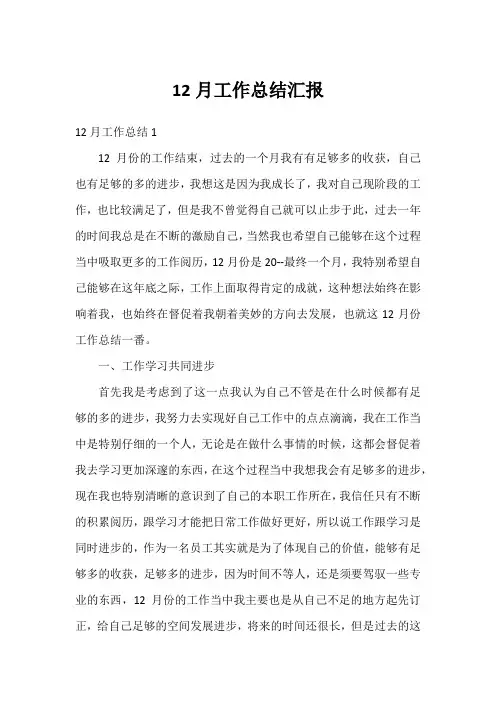12月工作总结汇报12月工作总结112月份的工作结束,过去的一个月我有有足够多的收获,自己也有足够的多的进步,我想这是因为我成长了,我对自己现阶段的工作,也比较满足了,但是我不曾觉得自己就可以止步于此,过去一年的时间我总是在不断的激励自己,当然我也希望自己能够在这个过程当中吸取更多的工作阅历,12月份是20--最终一个月,我特别希望自己能够在这年底之际,工作上面取得肯定的成就,这种想法始终在影响着我,也始终在督促着我朝着美妙的方向去发展,也就这12月份工作总结一番。
