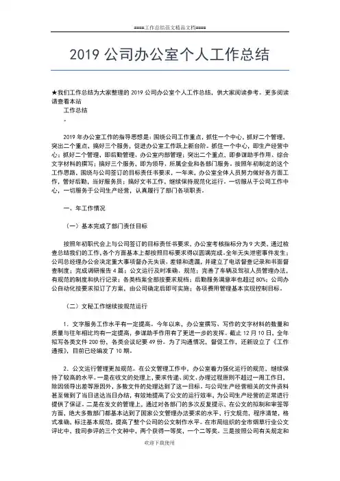 ====工作总结范文精品文档====2019公司办公室个人工作总结★我们工作总结为大家整理的2019公司办公室个人工作总结,供大家阅读参考。
