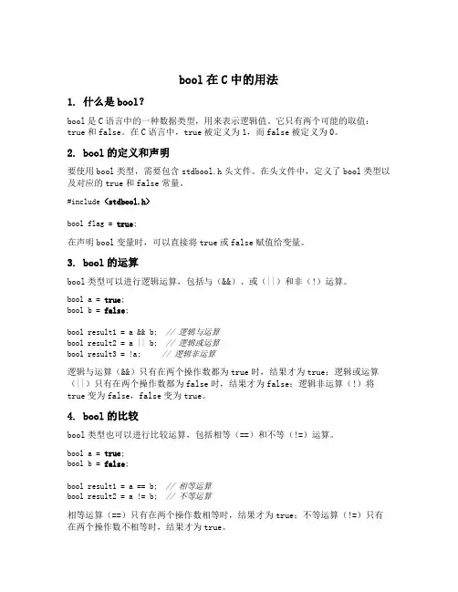 bool在C中的用法1. 什么是bool?bool是C语言中的一种数据类型,用来表示逻辑值。