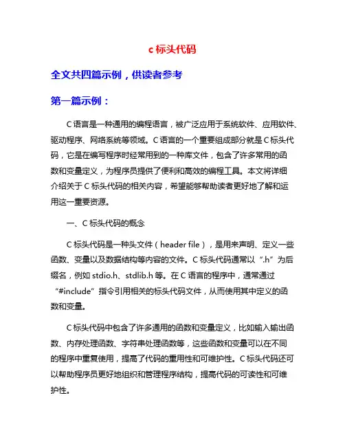 c 语言头函数源代码C语言头函数源代码在C语言中,头文件(header file)是一种包含函数声明、宏定义和类型定义的文件。