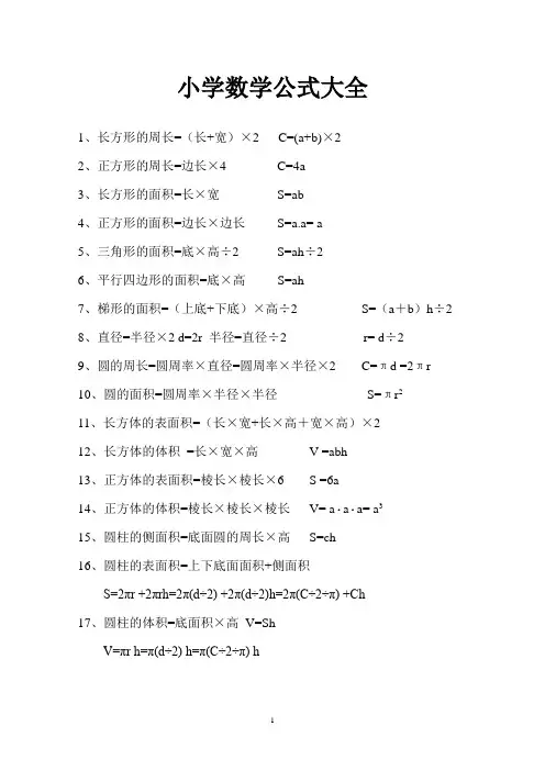 小学数学公式大全⒈长方形的周长=(长+宽)×2 公式C=(a+b)×2⒉正方形的周长=边长×4 公式C=4a⒊圆的周长=圆周率×直径=π×半径×2 公式c=πd =2πr⒈长方形的面积=长×宽公式S=ab⒉正方形的面积=边长×边长公式S=a×a= a²⒊三角形的面积=底×高÷2 公式S=ah÷2⒋平行四边形的面积=底×高公式S=ah⒌梯形的面积=(上底+下底)×高÷2 公式S=(a+b)h÷2直径=半径×2 d=2r 半径=直径÷2 r= d÷2⒍圆的面积=圆周率×半径×半径公式S=π r²内角和:三角形的内角和=180度。