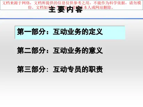 互动业务部经理岗位职责1、制定并组织实施本部门工作目标、业务计划和内部管理制度,确保部门高效有序运转;2、制定并组织实施互动业务发展规划、年度工作计划和互动业务管理制度,确保互动业务资源的有效利用和业务的健康、稳定发展;3、建立并维护与寿险公司及所属各部门、分支机构的良好合作关系;4、定期牵头召开互动业务协调会议,交流互动业务发展动态,解决产寿险各级机构矛盾和纠纷;5、制定并组织实施各种业务营销方案,及时改进互动销售策略,应变动态市场,组织各种互动营销活动;6、制订互动业务培训制度、培训大纲、培训教材和培训方案,协调公司相关部门对互动培训的支援,对寿险公司相关互动销售人员和管理人员进行培训;7、培训与管理产险专员,进行互动销售业绩分析和KPI 考核及分析,确保互动业务工作指标和KPI考核指标的完成;8、负责本部人员的日常管理和绩效考核,提出任免建议,保证对员工有效的管理与合理激励。