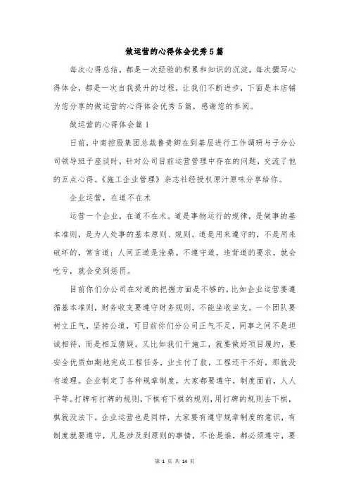 文档下载后可定制修改,请根据实际需要进行调整和使用,谢谢!并且,本店铺为大家提供各种类型的经典范文,如工作总结、报告大全、演讲致辞、条据书信、心得体会、党团资料、读后感、作文大全、教学资料、其他范文等等,想了解不同范文格式和写法,敬请关注!Download tips: This document is carefully compiled by this editor.I hope that after you download it, it can help you solve practical problems. The document can be customized and modified after downloading, please adjust and use it according to actual needs, thank you!In addition, this shop provides you with various types of classic sample essays, such as work summary, report encyclopedia, speeches, articles and letters, experience and experience, party and group information, after reading, composition encyclopedia, teaching materials, other sample essays, etc. I want to know the difference Please pay attention to the format and writing of the sample essay!运营工作心得体会7篇通过心得的写作,很多人都可以有很大的前进动力,当自身内心产生不少感想后,我们需要静下心来认真写好一篇心得体会,下面是本店铺为您分享的运营工作心得体会7篇,感谢您的参阅。