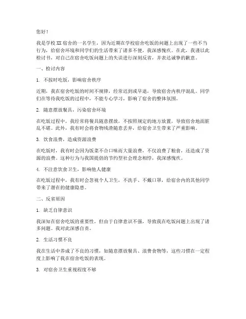 您好!我是学校XX宿舍的一名学生,因为近期在学校宿舍吃饭的问题上出现了一些不当行为,给宿舍环境和同学们的生活带来了诸多不便,我深感愧疚。