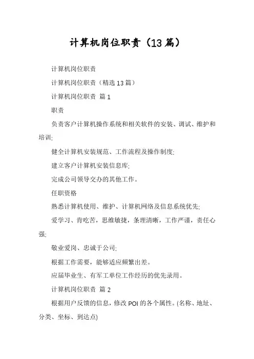 计算机工作岗位职责计算机工作岗位职责是指在计算机领域中从事相应工作的职位所需承担的职责和任务。