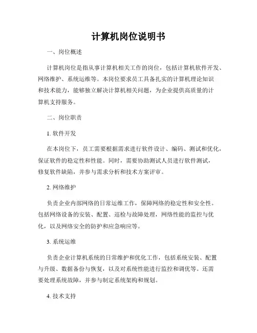 计算机岗位说明书一、岗位概述计算机岗位是指从事计算机相关工作的岗位,包括计算机软件开发、网络维护、系统运维等。