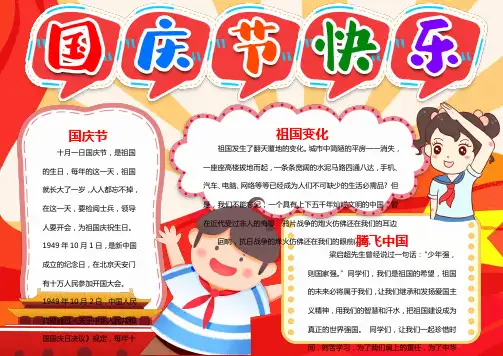 班级: 姓名:祖国啊,我为你自豪!当巍峨的华表,让挺拔的身躯披上曙光,当雄伟的天安门, 让风云迎来东升的太阳.历史的耳畔,传来了礼炮的隆隆响, 那排山倒海般的回响, 是中国沧桑巨变的回响. 一位巨人俯瞰着世界,洪亮的声音, 全世界都听到了,中华人民共和国成立了! 当第一面五星红旗冉冉升起,那胜利的旗帜,在朗朗的空中迎风飘扬,人民扬起了头颅, 全世界都看到了, 中国人民从此站起来了!国 庆 日 记今天是一个高兴的日子、热闹的日子、 令人激动的日子,因为是我们祖国母亲的生日 ——国庆节。