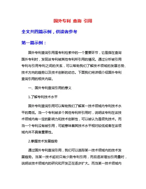 国外专利查询引用全文共四篇示例,供读者参考第一篇示例:国外专利查询引用是专利检索中的一个重要环节,它是指在查询国外专利时,发现该专利被其他专利所引用的情况。