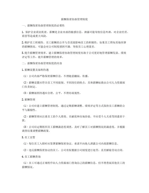二、薪酬保密协助管理制度的内容1. 薪酬设置及福利待遇(1)公司内部严格保密薪酬信息,不得随意翻阅、传播。