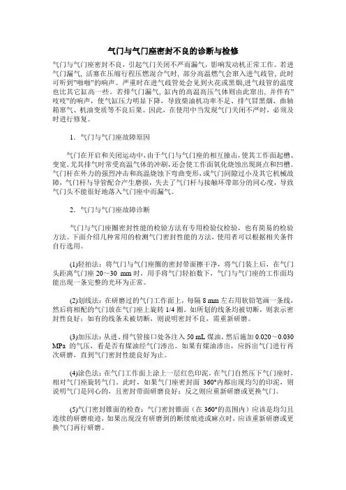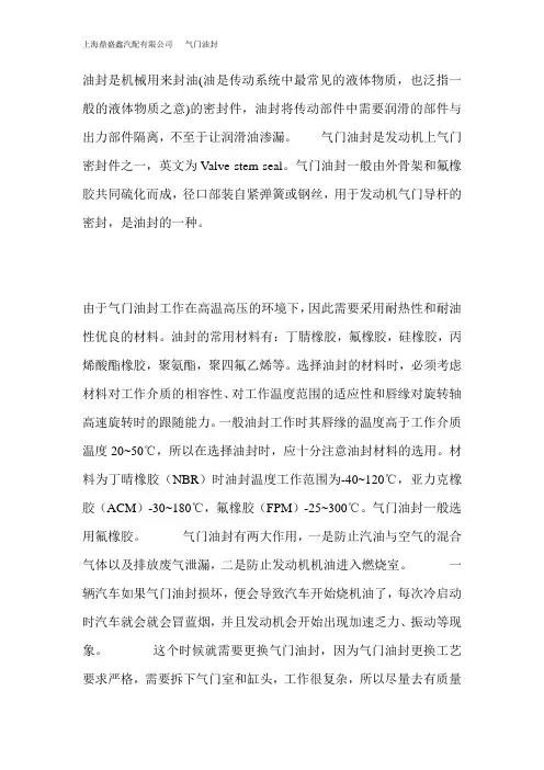 ①安装问题:a 密封安装方向错误导致泄漏b 安装时混入,或管路内异物,粉尘,进入密封引起泄漏c 装配不良造成密封损坏引起泄漏d 密封杆表面划痕引起泄漏f 同心度不够导致偏心,偏负荷引起泄漏g 涂层加工不匀,涂料进入密封圈②密封选用问题a 因压力过高造成间隙咬伤b 混入空气后,绝热压缩引起密封烧损c 密封材料与介质不相容,引起膨胀等材料变质反映d 高温引起材料变质略化e 低温导致材料硬化,收缩而引起泄漏f 高频往复运动导致密封件发热,干磨g 低压,低速时,运动不平稳h 润滑不良导致密封磨损加剧i 因元件受到震动因起泄漏j环境粉尘引起密封圈异常磨损k密封沟槽生锈引起泄漏③密封装配设计问题a 导向支承件材料选用不当,损伤缸筒,活塞杆b 摩擦副间隙不合适,导致间隙挤出咬伤c 缸筒活塞缸端部的螺纹导角不当,损伤密封圈d 刚度,自重计算错误引起运动状态不良e 密封安装导角不当损伤密封圈f 滑动面粗糙度不合适,磨损密封圈g 电镀不均匀,密封通过的表面上开孔,划伤,磨损密封圈h 密封沟槽,特别是轴密封槽粗糙度不够,磨损,损伤密封件i 活塞,活塞杆镀层气孔引起泄漏j润滑不良磨损,咬伤缸筒,活塞杆④产品质量问题,保管问题a 产品质量本身存在问题会加速产品老化,或者干脆就不能使用b 保管,运输时受到高温,引起密封材料变质,劣化c 强阳光臭氧,放射线引起密封材料变质d缺乏适当的保存方法,使密封圈变形e 长期存放引起密封材料老化上面介绍了气门油封老化产生的原因,下面简单介绍一下气门油封老化损坏的症状。