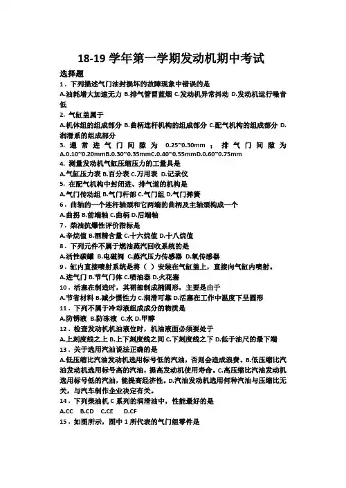 18-19学年第一学期发动机期中考试选择题1 . 下列描述气门油封损坏的故障现象中错误的是A.油耗增大加速无力B.排气管冒蓝烟C.发动机异常抖动D.发动机运行噪音低2. 气缸盖属于A.机体组的组成部分B.曲柄连杆机构的组成部分C.配气机构的组成部分D.润滑系的组成部分3.通常进气门间隙为0.25~0.30mm;排气门间隙为A.0.10~0.20mmB.0.30~0.35mmC.0.40~0.55mmD.0.60~0.75mm4. 测量发动机气缸压缩压力的工量具是A.气缸压力表B.百分表C.万用表D.记录仪5. 在配气机构中封闭进、排气道的机构是A.气门传动组B.气门杆部C.气门组D.气门弹簧6 . 曲轴的一个连杆轴颈和它两端的曲柄及主轴颈构成一个A.曲拐B.前端轴C.曲柄D.后端轴7 . 柴油抗爆性评价指标是A.辛烷值B.酒精含量C.十六烷值D.十八烷值8 . 下列元件不属于燃油蒸汽回收系统的是A.活性碳罐B.电磁阀C.蒸汽压力传感器D.氧传感器9 . 缸内直接喷射系统是将()安装在气缸盖上,直接向气缸内喷射。