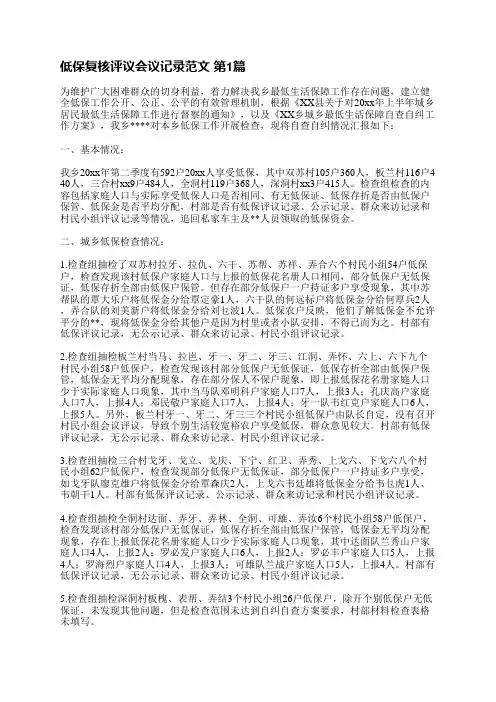 低保复核评议会议记录范文第1篇为维护广大困难群众的切身利益,着力解决我乡最低生活保障工作存在问题,建立健全低保工作公开、公正、公平的有效管理机制,根据《XX县关于对20xx年上半年城乡居民最低生活保障工作进行督察的通知》,以及《XX乡城乡最低生活保障自查自纠工作方案》,我乡****对本乡低保工作开展检查,现将自查自纠情况汇报如下:一、基本情况:我乡20xx年第二季度有592户20xx人享受低保,其中双苏村105户360人,板兰村116户4 40人,三合村xx9户484人,全洞村119户368人,深洞村xx3户415人。