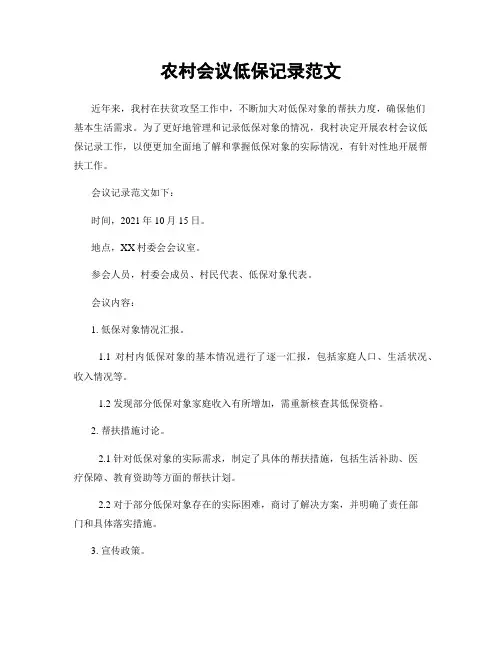 农村会议低保记录范文近年来,我村在扶贫攻坚工作中,不断加大对低保对象的帮扶力度,确保他们基本生活需求。