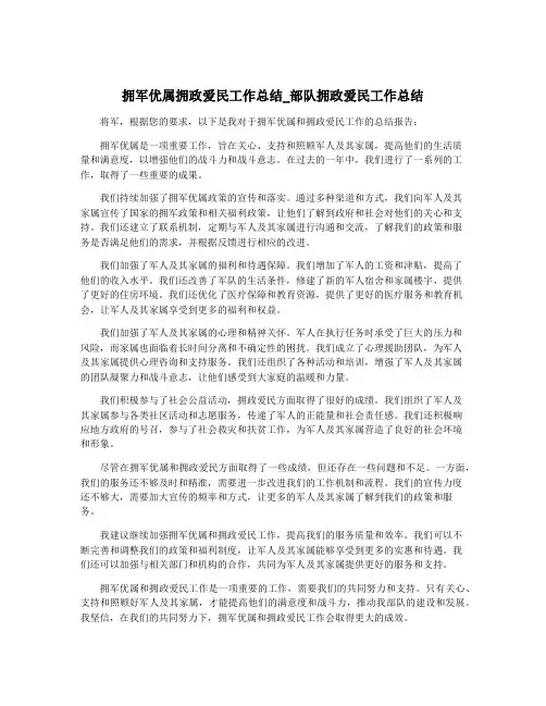 双拥(拥军优属拥军爱民)工作总结8篇第1篇示例:双拥(拥军优属拥军爱民)工作总结双拥工作是党和政府长期以来高度关注的工作之一,旨在深入贯彻军民团结,支援部队建设的方针政策,维护维战国家安全和社会稳定。