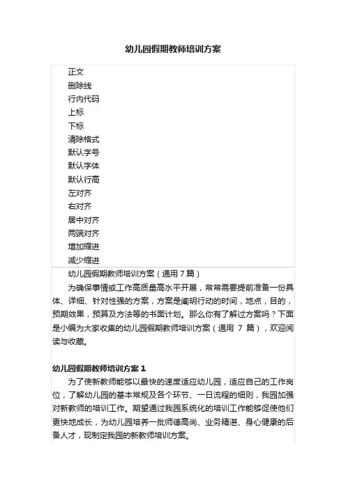幼儿园假期教师培训方案一、指导思想适应教育改革发展要求,根据新教师的成长规律,确立“系统培养,分段实施,名师引领,逐级提升”的指导思想,以提高新教师的活动设计、教育教学、家长工作等能力,逐步实施幼儿园园本课程,在班长及师傅的引领和帮助下实施园本课程的教育教学、保育保健。
