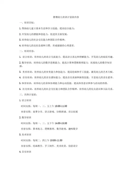 暑期幼儿培训计划表内容一、培训目标:1. 帮助幼儿建立基本生活和学习技能,提高综合能力;2. 开发幼儿的潜能和创造力,促进其全面发展;3. 培养幼儿的社会交往能力和团队合作精神;4. 培养幼儿的良好品德和习惯,形成健康的心理素质。