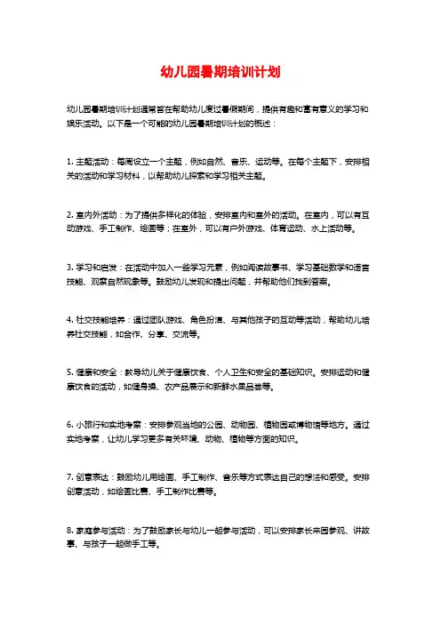 三、活动安排:本次暑假培训计划为期一个月,每周安排一次主题活动,具体安排如下:第一周:亲子游戏活动活动内容:组织家长和孩子参与各种亲子游戏,增进亲子情感,促进家庭和谐。