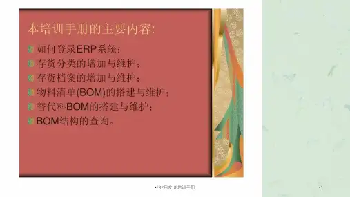 U8培训资料—用友ERP-U8项目建立日期: 2003-2-27修改日期: 2003-3-6文控编号: BJZX-SS-U8-02项目培训材料版本编号: V3.0作者:审核:目录第一章用友ERP—U8财务治理体系 (3)一、体系治理功能 (3)二、总帐处理体系 (6)三、UFO报表体系 (13)四、应收敷衍体系 (17)五、工资治理体系 (20)六、固定资产治理体系 (24)第二章 U8数据增量复制 (28)一、U8增量数据复制 (28)二、日常操作和须知 (37)第三章 U8日常爱护常识和应用技能 (37)一、日常问题及解决方法 (37)二、软件操作技能 (44)附:一期四户试点单位显现的问题和解决方法第一章用友ERP—U8财务治理体系一、体系治理功能内容提纲:1、建立本单位帐套;2、增长、修改、删除操作员;3、操作员赋权(帐套主管权限和一样操作员权限);4、体系治理中刷新操作、清除专门义务操作、清除单据锁定操作;5、上机日记;6、帐套数据备份和复原;7、年度帐数据的备份和复原;8、新建年度帐和年度帐结转。