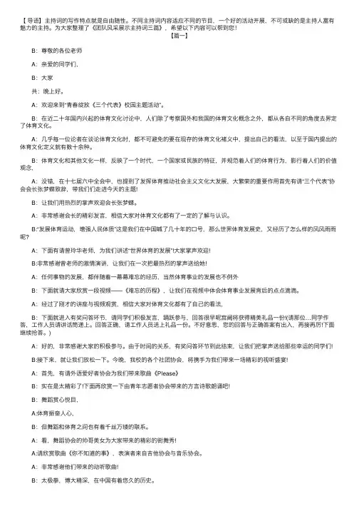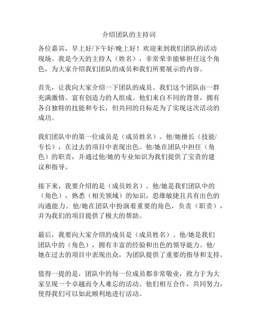 关于介绍团队的主持演讲稿第一篇:《团队展示串词1》团队展示-保证有效教学---西校区暑期校本培训主持人串词程序:第一部分:开场白第二部分:学校简介第三部分:我们的团队第四部分:团队展示第五部分:教研组汇报第六部分:总结展望第一部分:开场白尊敬的各位领导、各位同仁,大家上午好!首先做个自我介绍,我叫王在进,西校区教导副主任,因为丁校长在外学习,所以今天由我来主持。