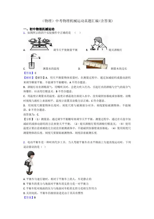 (物理)中考物理机械运动真题汇编(含答案)含解析一、初中物理机械运动1.下列说法正确的是()A. 坐在教室考试的你,以来回走动的监考老师为参照物,你是运动的B. 速度是表示做功快慢的物理量C. 医院里B超机是利用次声波具有穿透力强这一特点工作的D. 桌面上的书之所以静止是因为力的作用是相互的【答案】 A【解析】【解答】解:A、以来回走动的监考老师为参照物,坐在教室考试的你与监考老师之间的位置不断变化,因此你是运动的。