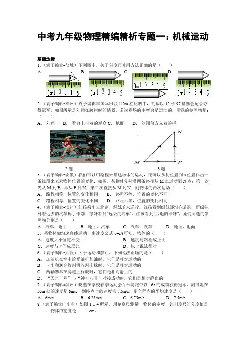 中考九年级物理精编精析专题一:机械运动基础达标 . C D得冠军.如图所示是刘翔在跨栏时的情景,若说赛场的主席台是运动的,所选的参照物是:( )A . 刘翔B . 看台上坐着的观众C . 地面D . 刘翔前方立着的栏2题 3题3.(袁子编辑•安徽)我们可以用路程来描述物体的运动,还可以从初位置到末位置作出一条线段来表示物体位置的变化.如图,某物体分别沿两条路径从M 点运动到N 点:第一次先从M 到P ,再从P 到N ;第二次直接从M 到N .则物体的两次运动( )A . 路程相等,位置的变化相同B . 路程不等,位置的变化不同C . 路程相等,位置的变化不同D . 路程不等,位置的变化相同4.(袁子编辑•滨州)红孩乘车去北京,绿妹前来送行.红孩看到绿妹逐渐向后退,而绿妹对着远去的汽车挥手作别.绿妹看到“远去的汽车”、红孩看到“后退的绿妹”,她们所选的参A . 加油机在空中给受油机加油时,它们是相对运动的B . 卡车和联合收割机收割庄稼时,它们是相对运动的C . 两辆赛车在赛道上行驶时,它们是相对静止的D . “天宫一号”与“神舟八号”对接成功时,它们是相对静止的7.(袁子编辑•滨州)晓燕在学校春季运动会百米赛跑中以16s 的成绩获得冠军,测得她在8.(袁子编辑广东省)如图1-1-4所示,用刻度尺测量一物体的宽度,该刻度尺的分度值是____,物体的宽度是______cm 。