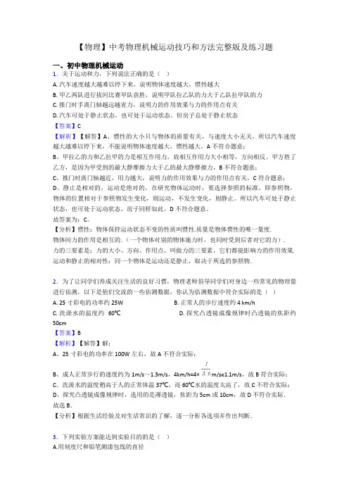 【物理】中考物理机械运动技巧和方法完整版及练习题一、初中物理机械运动1.关于运动和力,下列说法正确的是()A. 汽车速度越大越难以停下来,说明物体速度越大,惯性越大B. 甲乙两队进行拔河比赛甲队获胜,说明甲队拉乙队的力大于乙队拉甲队的力C. 推门时手离门轴越远越省力,说明力的作用效果与力的作用点有关D. 汽车可处于静止状态,也可处于运动状态。