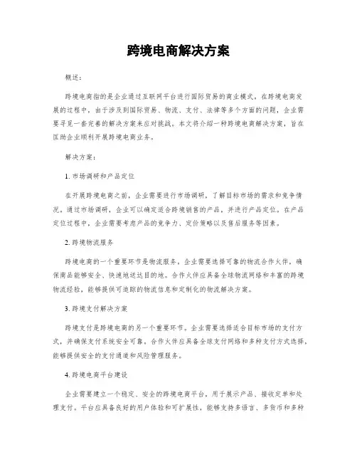 二、跨境电商解决方案的基本概念跨境电商解决方案是指为了解决跨境电商业务中的问题而提供的一系列解决方案。