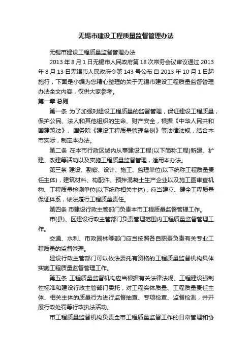无锡市建设工程质量监督管理办法无锡市建设工程质量监督管理办法2013年8月1日无锡市人民政府第18次常务会议审议通过 2013年8月13日无锡市人民政府令第143号公布自2013年10月1日起施行,下面是小编为您精心整理的关于无锡市建设工程质量监督管理办法全文内容,仅供大家参考。