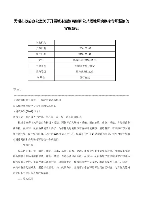 无锡市政府办公室关于开展城市道路两侧和公共场地环境秩序专项整治的实施意见正文:---------------------------------------------------------------------------------------------------------------------------------------------------- 无锡市政府办公室关于开展城市道路两侧和公共场地环境秩序专项整治的实施意见(锡政办发[2006]15号)各市(县)和各区人民政府,市各委、办、局,市各直属单位:根据市政府《关于禁止在街道(道路)两侧等公共场地(设施)擅自堆放、作业、搭建、占道经营和乱牵挂、乱涂写、乱张贴的通告》要求,为维持良好的城市市容和环境秩序,创造整洁、有序的市容面貌和生活环境,提升城市形象,决定于2006年2月-4月,以城市主环内54条道路为重点,集中力量开展城市道路两侧和公共场地环境秩序专项整治。