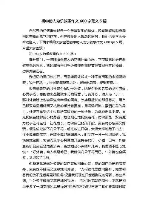 帮助他人作文600字篇1在人生的旅程中,每个人的生活都离不开别人的帮助,因为自然界的任何事物都是一个普遍联系的整体,没有谁能够脱离周围的事物而孤立地存在,但在接受别人帮助的同时,我们也要学会去帮助别人。