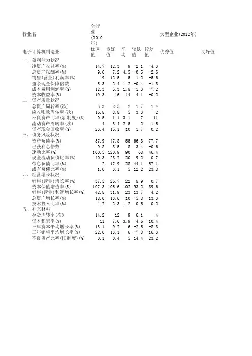行业名全行业(2010年)大型企业(2010年)电子计算机制造业优秀值良好值平均值较低值较差值优秀值良好值一、盈利能力状况净资产收益率(%)14.712.39-2.1-4.3总资产报酬率(%)9.67.2 4.5-0.5-2.6销售(营业)利润率(%)1912.55 1.2-5.6盈余现金保障倍数 5.3 2.4 1.2-0.4-1.8成本费用利润率(%)12.3 5.3 1.8-1.3-7.2资本收益率(%)19.31614 4.1-0.2二、资产质量状况总资产周转率(次) 3.3 2.52 1.7 1.4应收账款周转率(次)16.88.85 3.32不良资产比率(新制度)(%)0.5 1.1 3.1711流动资产周转率(次)4 3.4 2.52 1.5资产现金回收率(%)23.415.110 1.70.2三、债务风险状况资产负债率(%)37.947.85566.377.7已获利息倍数9.88.58 3.4-0.6速动比率(%)160.5120.9906846.4现金流动负债比率(%)40.328.7209.20.7带息负债比率(%)217.92844.157.1或有负债比率(%) 1.6 3.1512.223.8四、经营增长状况销售(营业)增长率(%)37.526.7228.90.7资本保值增值率(%)107.3105.610293.289.6销售(营业)利润增长率(%)42.831.92313.7 4.2总资产增长率(%)18.613.610-5.8-13.3技术投入比率(%) 4.7 2.3 1.20.50.2五、补充材料存货周转率(次)14.2129 6.14资本积累率(%)117.6 3.9-4.6-10.4三年资本平均增长率(%)13.19.76-2.5-8.3三年销售平均增长率(%)22.613.16-7.8-16.3不良资产比率(旧制度)(%)0.10.4514.423.2中型企业(2010年)小型企业(2010年)平均值较低值较差值优秀值良好值平均值较低值较差值优秀值全行业(2009年)大型企业(2009年)良好值平均值较低值较差值优秀值良好值平均值较低值较差值优秀值良好值10.38 4.6-6.4-8.77.6 5.2 2.5-2.5-4.618.512 4.50.7-6.14.5 1.60.4-1.2-2.611.2 4.20.7-2.4-8.311.48.3 6.1-3.6-8.12 1.20.70.40.115.77.7 3.9 2.20.90.2 2.3 4.38.212.23 2.4 1.510.515.27.1 1.8-6.3-13.648.758.465.876.988.56.8 4.2 2.6-1.9-6154.4114.983.96240.322.211 1.9-8.5-17.424.840.250.866.479.92.13.6 5.512.724.325.915.310.4-2.5-10.9109.5107.8104.295.491.823.613.1 3.8-5.1-1515.410.5 6.8-8.9-16.55.2 2.8 1.710.311.49.3 6.2 3.4 1.27.8 4.50.7-7.7-13.67.9 4.60.8-7.6-13.526.416.89.8-4.1-12.50.10.4514.423.2中型企业(2009年)小型企业(2009年)平均值较低值较差值优秀值良好值平均值较低值较差值优秀值全行业(2008年)大型企业(2008年)良好值平均值较低值较差值优秀值良好值平均值较低值较差值优秀值良好值10.98.6 5.2-3.8-8.17.6 5.2 2.5-2.5-4.622.913.2 3.60.7-64.5 1.60.4-1.2-2.612.1 4.50.8-2.2-7.712.49 6.7-3.3-7.52.1 1.30.60.40.215.77.7 3.9 2.20.90.3 2.4 4.48.312.33 2.4 1.50.80.515.47.32-6.1-13.447.957.670.378.187.78.5 5.9 2.3-2.2-6.3177.9138.597.475.633.82311.8 2.6-7.7-16.622.237.748.263.977.32.23.7 5.612.824.424.214.77.7-6.1-14.6109.5107.8104.295.491.823.312.8 2.5-7.4-18.314.510 3.9-12.7-20.45.2 2.6 1.30.80.111.49.3 6.2 3.4 1.27.9 4.60.8-7.6-13.511.57.5 2.6-8.6-19.320.91912.9-1.5-10.90.3 1.7 6.315.724.5中型企业(2008年)小型企业(2008年)平均值较低值较差值优秀值良好值平均值较低值较差值优秀值全行业(2007年)大型企业(2007年)良好值平均值较低值较差值优秀值良好值平均值较低值较差值优秀值良好值11.99.4 5.7-3.5-7.48 5.6 2.9-2.1-4.223.313.64 1.1-5.64.5 1.60.4-1.2-2.612.1 4.50.8-2.2-7.712.49 6.7-3.3-7.52.1 1.30.60.40.215.97.9 4.1 2.4 1.10.3 2.4 4.48.312.33 2.4 1.50.80.515.47.32-6.1-13.452.261.674.281.691.48.7 6.1 2.5-2-6.1180140.499.377.335.623.212 2.8-7.5-16.423.438.849.364.978.31.5 3.1512.323.827.217.410.4-3.7-12111.6108.8105.295.491.823.312.8 2.5-7.4-18.315.310.7 4.6-12.1-19.75.2 2.6 1.30.80.114.9139.2 4.2 1.47.9 4.60.8-7.6-13.511.57.52-8.6-19.324.219.313.2-1.3-10.70.3 1.7 6.315.724.5中型企业(2007年)小型企业(2007年)平均值较低值较差值优秀值良好值平均值较低值较差值优秀值全行业(2006年)大型企业(2006年)良好值平均值较低值较差值优秀值良好值平均值较低值较差值优秀值良好值11.49.4 5.7-3.5-7.47.6 5.6 2.9-2.1-4.222.213.64 1.1-5.64.3 1.60.4-1.2-2.611.5 4.50.8-2.2-7.711.89 6.7-3.3-7.52 1.30.60.40.215.87.9 4.1 2.4 1.10.3 2.4 4.48.312.32.9 2.4 1.50.80.514.6 6.6 1.3-6.7-145463.275.78392.88.7 6.1 2.5-2-6.1180140.499.377.335.620.79.70.7-9.5-18.423.438.849.364.978.30.4 1.3614.523.825.115.58.7-5.3-13.6111.6108.8105.295.491.82312.5 2.3-7.6-18.517.712.9 6.6-10.2-17.84.8 2.310.50.115.413.59.6 4.6 1.810.97.4 3.3-5.2-11.19.9 6.10.7-9.8-20.5262114.70.1-9.30.4 1.8 6.415.824.6中型企业(2006年)小型企业(2006年)平均值较低值较差值优秀值良好值平均值较低值较差值优秀值全行业(2005年)大型企业(2005年)良好值平均值较低值较差值优秀值良好值平均值较低值较差值优秀值良好值14.910.86-4.1-8.610.7 6.8 3.3-2-4.225.614.8 2.8-0.3-7.24.3 1.6-0.4-1.2-2.614.86 1.3-1.9-12.72.3 1.60.90.60.116.18.2 4.4 2.7 1.400.9 1.77.110.53 2.5 1.60.90.347.356.56976.386.114.59 3.6-1.6-6.5171.3131.890.868.726.919.811.80.4-7.4-16.334.526.48-6.8-49.2110.1106.3103.899.993.34.9 2.7 1.10.60.219.615.712.88.8 6.312.78.3 3.2-5.7-11.912.2 6.90.7-10.3-28.622.916.78.8-5.2-32.5中型企业(2005年)小型企业(2005年)平均值较低值较差值优秀值良好值平均值较低值较差值优秀值全行业(2004年)大型企业(2004年)良好值平均值较低值较差值优秀值良好值平均值较低值较差值优秀值良好值8.4 5.70.1-7.5-12.39.7 5.7 1.6-2.5-4.538.230.519.215.39.86.8 1.90.7-0.1-0.510.4 3.6-1-1.7-3.52.5 1.610.90.518.610 3.7 2.9 1.30 2.2 6.716.2252.9 2.3 1.5 1.10.536.345.55865.375.112.78.2 4.3-1.5-6.5199.4154.1108.79658.419.613.3 4.6-1.3-10.245.235.324.915.4 4.5107.7102.9100.697.691.54.9 2.7 1.10.60.213.611.19.17.1 4.9117.50.2-6.4-17.317.512.2 6.1-2.3-17.229.717.8147-20.6中型企业(2004年)小型企业(2004年)平均值较低值较差值优秀值良好值平均值较低值较差值优秀值全行业(2003年)大型企业(2003年)良好值平均值较低值较差值优秀值良好值平均值较低值较差值优秀值良好值11.38.7 3.2-4.5-9.410.58.530.4-5.228.620.79.2 5.50.283 1.710.711.1 4.80.7-0.5-2.82.1 1.20.60.50