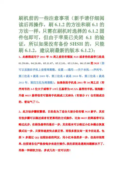 刷机前的一些注意事项(新手请仔细阅读后再操作,刷6.1.2的方法和刷6.1的方法一样,只需在刷机时选择的6.1.2固件包即可,但由于苹果已关闭 6.1的验证,所以如果没有备份SHSH的,只能刷6.1.2,建议刷最新的版本6.1.2):1、此教程适用于2011年34周之前的有锁版3GS或者你的基带已经是01.59.00、04.26.08、05.11.07、05.12.01、05.13.04、06.15.00的3GS(你可以直接在手机上查看周期数,设置—>通用—>关于本机—>序列号,第三位是9就是2009年,第三位是0就是2010年,第三位是1就是2011年,第四五位为周期数),如果你的手机是2011年34周之后(即序列号的3-5位大于或等于135)且基带为05.XX基带的手机,很抱歉!升级0615基带很有可能将手机刷成三无砖头(有部分FY也有刷成功的,看运气了!)。