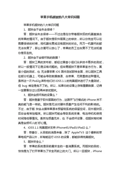 苹果手机越狱的八大常识问题苹果手机越狱的八大常识问题1、越狱会不会失去保修?答:越狱会失去保修——不过这是在你带着越狱后的机器直接去找苹果的情况下。