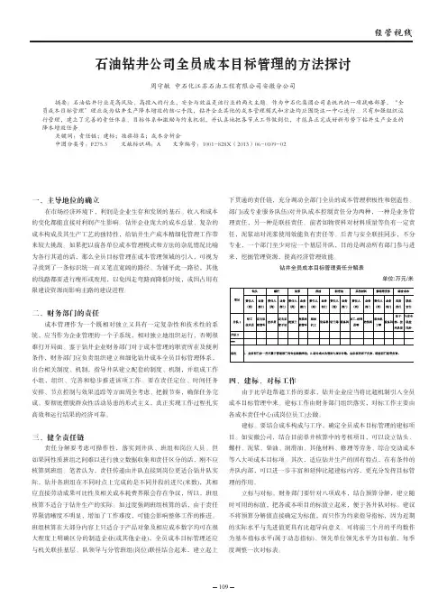 油田公司成本管控实施方案1. 背景随着市场竞争的加剧,油田公司的成本管控更加重要,仔细管控每一个成本环节可以让企业在竞争激烈的市场获得更大的优势,有效降低成本,增强盈利能力。