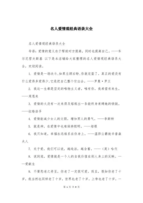你所见过的语录是什么样的呢?下⾯是⼩编帮⼤家整理的爱情名⼈名⾔经典语录,希望对⼤家有所帮助。