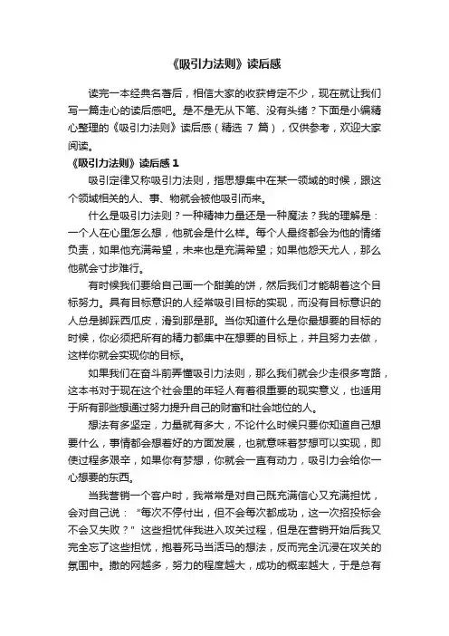 《吸引力法则》读后感(精选多篇)第一篇:《吸引力法则》读后感《吸引力法则》读后感什么是吸引力法则?一种精神力量还是一种魔法?我的理解是:一个人在心里怎么想,他就会是什么样。